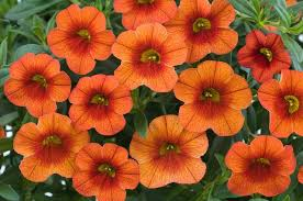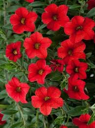 Calibrachoa are nicknamed Million Bells. They feature cascades of tiny petunia-like flowers which cover this low trailing plant. They benefit from feeding and sunshine providing wonderful color throughout the summer without deadheading.